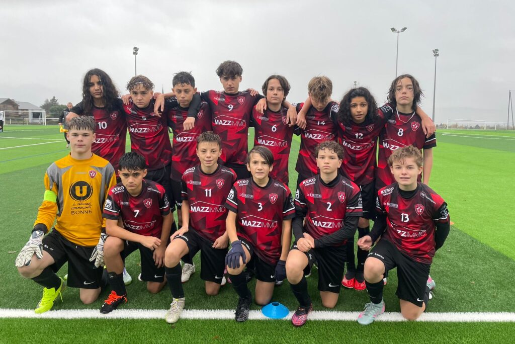 Catégorie U15 Fanions – Coupe de District – 2ème Tour vs ES Fillinges 0 – 3 Le résumé du match : Match compliqué pour nos U15 Fanions, qui ont manqué leur entame et ont rapidement été sanctionnés. Au bout de 20 minutes de jeu, le score affichait déjà 2-0 pour Fillinges, conséquence d’un manque d’intensité et d’une absence de réaction d’orgueil sur l’ensemble de la première période. Sans répondre au rythme imposé par l’adversaire, nos jeunes se sont retrouvés en difficulté et n’ont jamais réellement réussi à se montrer dangereux avant la pause. En seconde mi-temps, face à un adversaire plus bas, nos joueurs ont enfin pris le contrôle du ballon et dominé la possession. Pour autant, ce regain de maîtrise n’a pas suffi : trop peu de prises d’initiatives offensives, manque d’agressivité dans les zones décisives et incapacité à faire peser un réel danger sur le portier adverse. Comme souvent dans ces scénarios, l’efficacité fait la différence : à force de ne pas concrétiser, nos joueurs se sont fait punir sur une contre-attaque à la 60ème minute, scellant le sort du match. Score final 3-0. Une élimination frustrante, mais riche en enseignements. Il faudra se montrer plus conquérants, plus ambitieux et répondre dès le coup d’envoi dans les prochaines rencontres. Maintenant, place au championnat, avec l’objectif de rebondir dès dimanche prochain. Meilleures prestations : Marius CAPUCCIO, Sofiane EL MAHSINNI Carton vert : Marius CAPUCCIO Prochain rendez-vous : Dimanche 9 Novembre à 10H00, 1ère journée de championnat U15 D2, Stade Gilbert DUCHÊNE contre Mont Blanc Passy